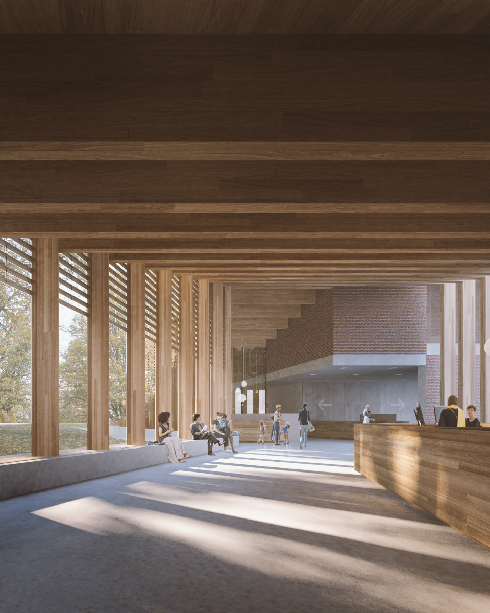 Het project kenmerkt zich door het gebruik van hoogwaardige gelamineerde houten (glulam) balken en kolommen, die duidelijk zichtbaar blijven in het interieur.